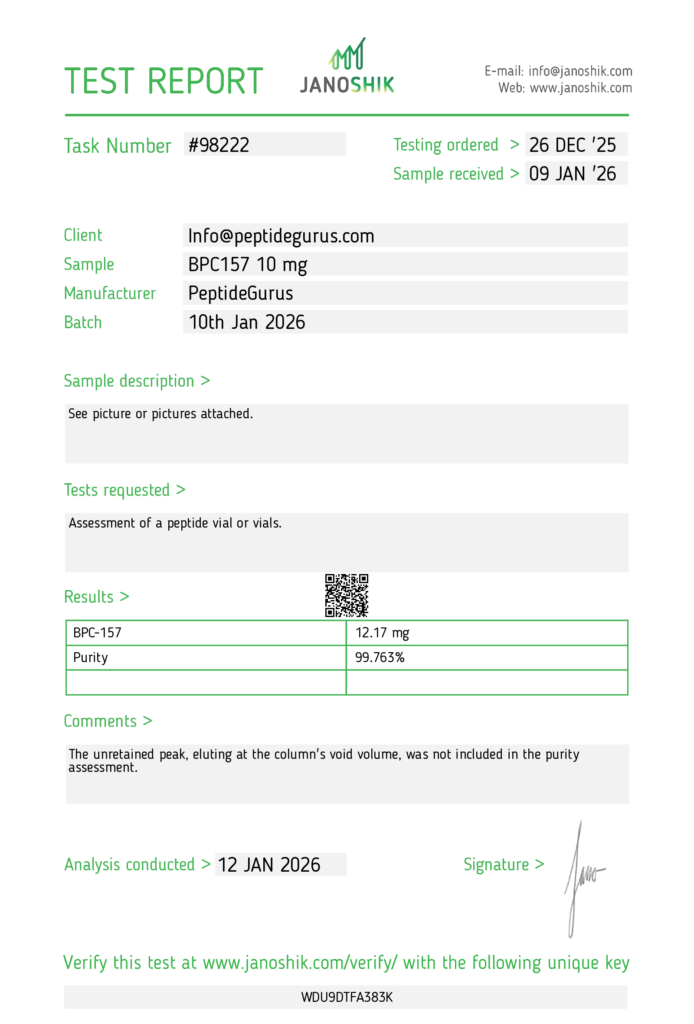Product Usage: BPC-157 is designated strictly for research purposes, intended for in vitro testing and laboratory experimentation only. It is not for human or animal use, and handling must be conducted by licensed, qualified professionals. This compound is not to be misclassified as a drug, food, or cosmetic.