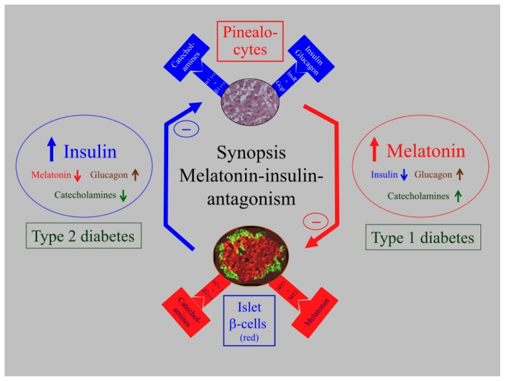 Both exogenous and endogenous melatonin inhibit the pathophysiological mechanisms of metabolic syndrome and normalize metabolism[3]. Research shows that melatonin receptors exist in the pancrease where they serve to modulate insulin and glucagon signaling in a diurnal (daylight-sensitive) fashion[4]. There is a lot of new research focusing on how disruptions in melatonin signaling are linked to the development of type 2 diabetes and metabolic syndrome.